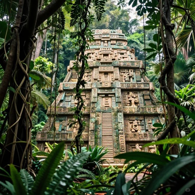 Ancient Mayan-style pyramid surrounded by dense tropical rainforest foliage with hanging vines and vibrant green plants. The structure features intricate stone carvings and geometric patterns, evoking a mystical and magical atmosphere.