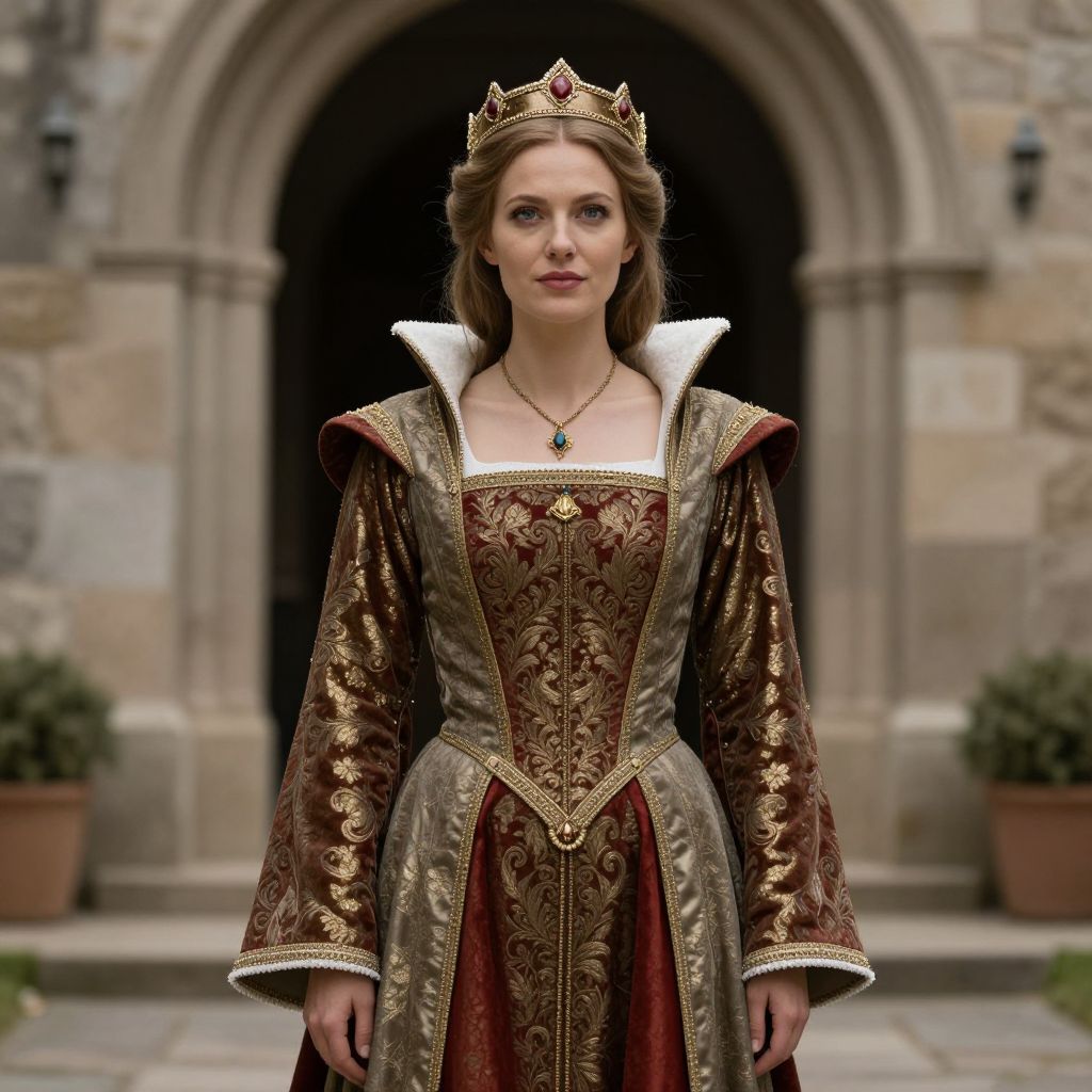 Photograph of a young woman in medieval attire: ornate, gold-embroidered red gown, white collar, gold crown, standing before a