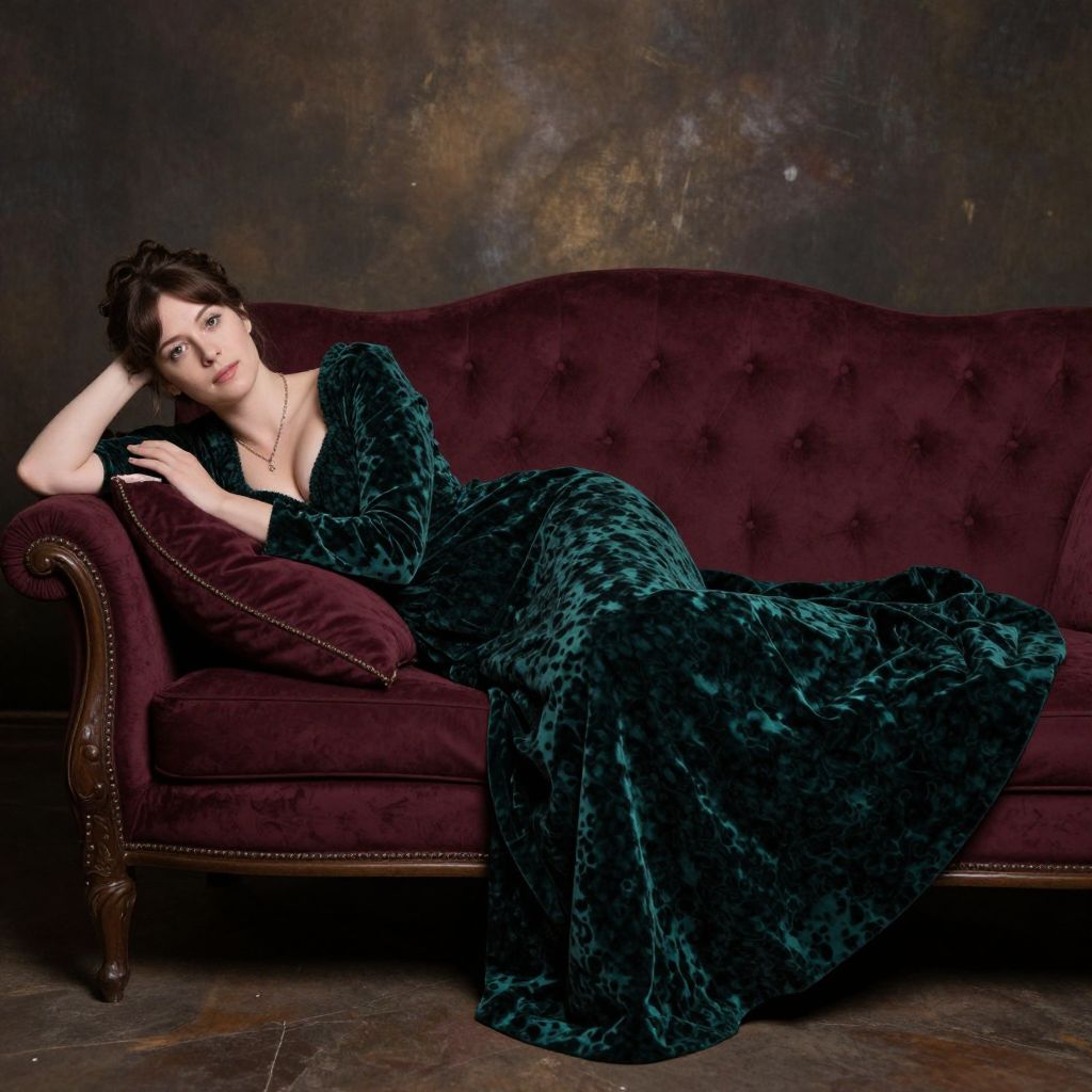 Photograph of a pale-skinned woman with dark curly hair, wearing a luxurious dark green velvet dress, reclining on a rich burgundy velvet sofa