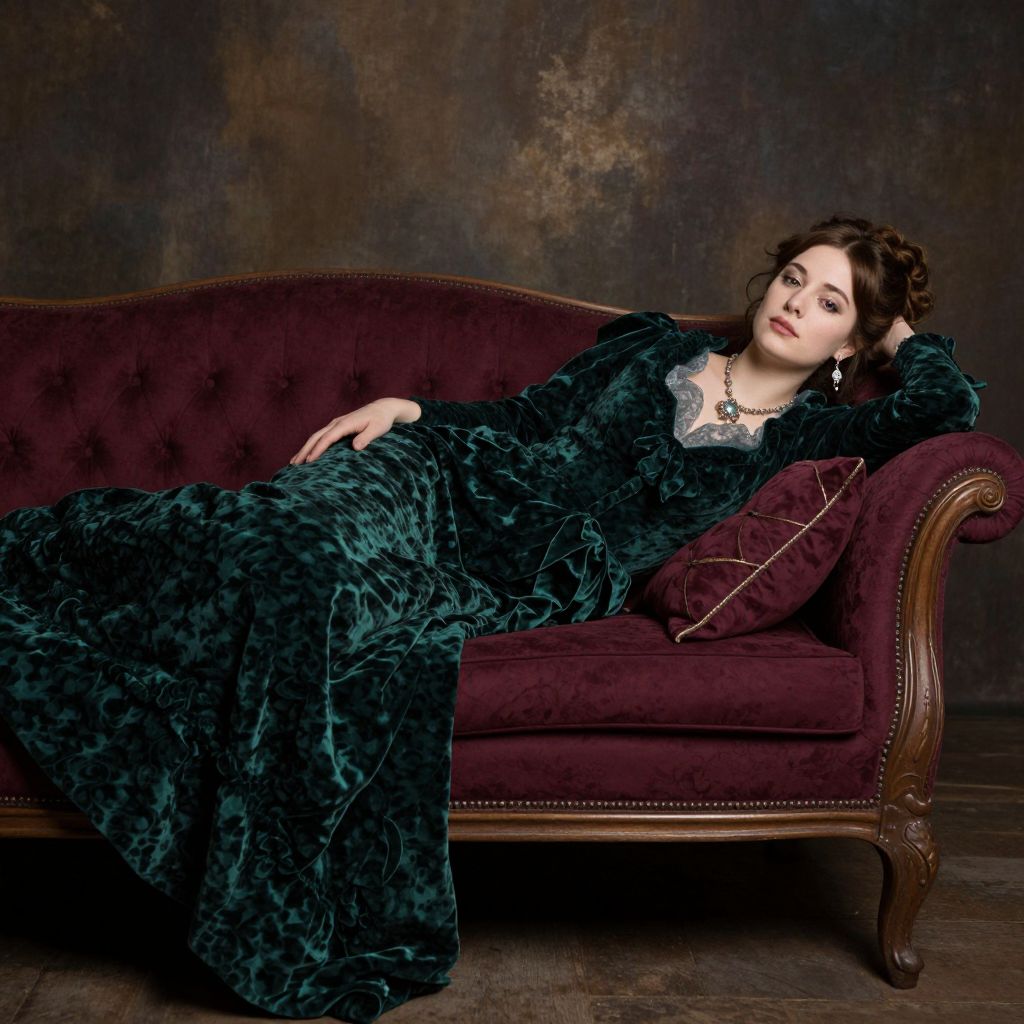 Elegant Victorian woman reclines gracefully on a plush maroon fainting couch, her emerald green velvet gown cascading elegantly as she rests her head on a matching pillow, exuding timeless sophistication against a moody, textured backdrop.