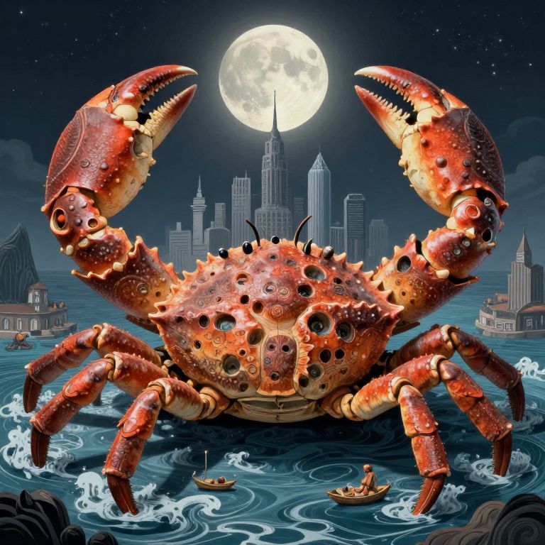 Giant orange crabs stand guard around a colossal crab shell, its interior revealing a fantastical cityscape of spires and domes, as two moons hang in the sky above the tranquil ocean.
