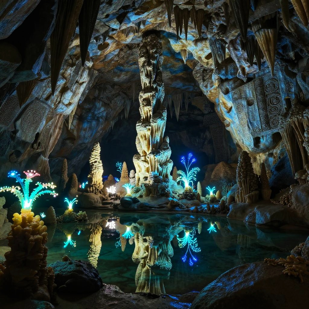 Caverna inside a vast underground cavern, glowing bioluminescent plants illuminating stalactites and stalagmites, crystal clear underground lake reflecting light, mysterious ancient carvings on stone walls, fantasy adventure atmosphere, ultra-detailed.