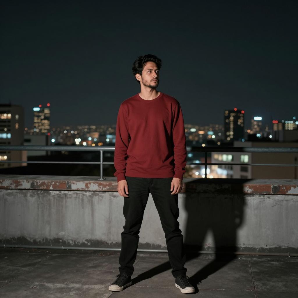 An artistic photograph of a man standing on a rooftop at night, with a backdrop of city lights illuminating the skyline. The man is styled casually in a red long-sleeve top and black pants, exuding a contemplative mood against the urban landscape.