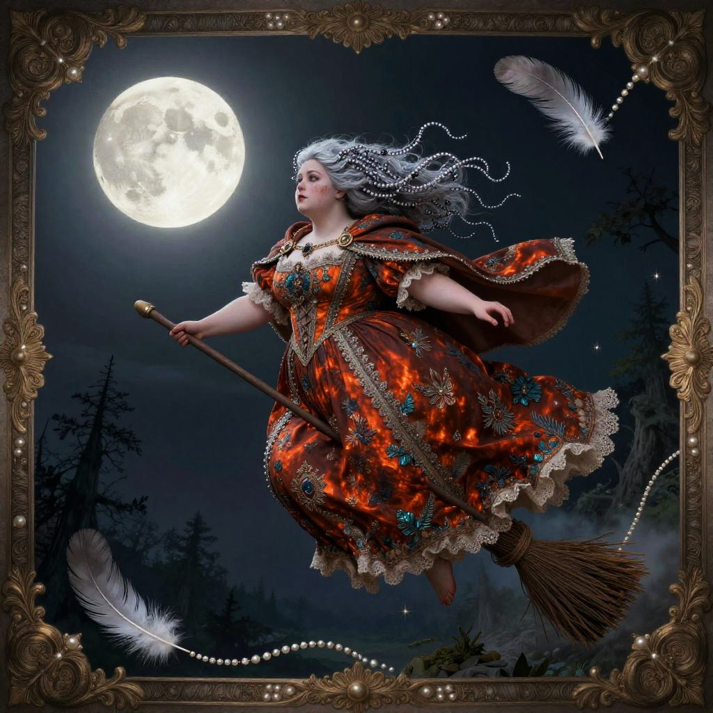 A whimsical, gothic fairytale illustration of a plump and magical woman with silver-streaked beaded finger waves, flying through a surreal night sky on a broom, surrounded by feathers and pearls, in front of a glowing full moon. She wears a voluminous ember-embroidered brocade cape-gown with delicate lace and ornate details, framed by an elaborate vintage border. The scene is rendered in a highly decorative style with muted jewel tones and a mystical forest below.