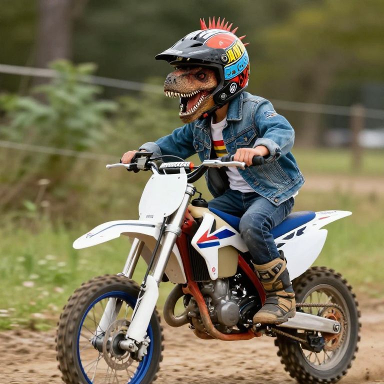 A teenage punk velociraptor wearing a helmet and denim jacket rides a dirtbike.