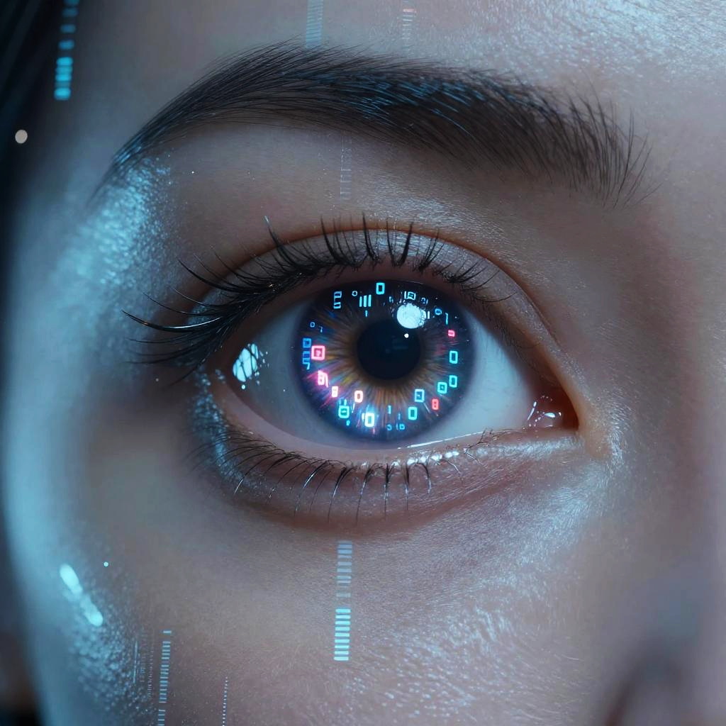 512г—512 cybernetic concept art, robotic eye with numeric code reflection, metallic textures and digital particles floating around, immersive sci-fi environment with blue and silver color palette, highly detailed and realistic rendering