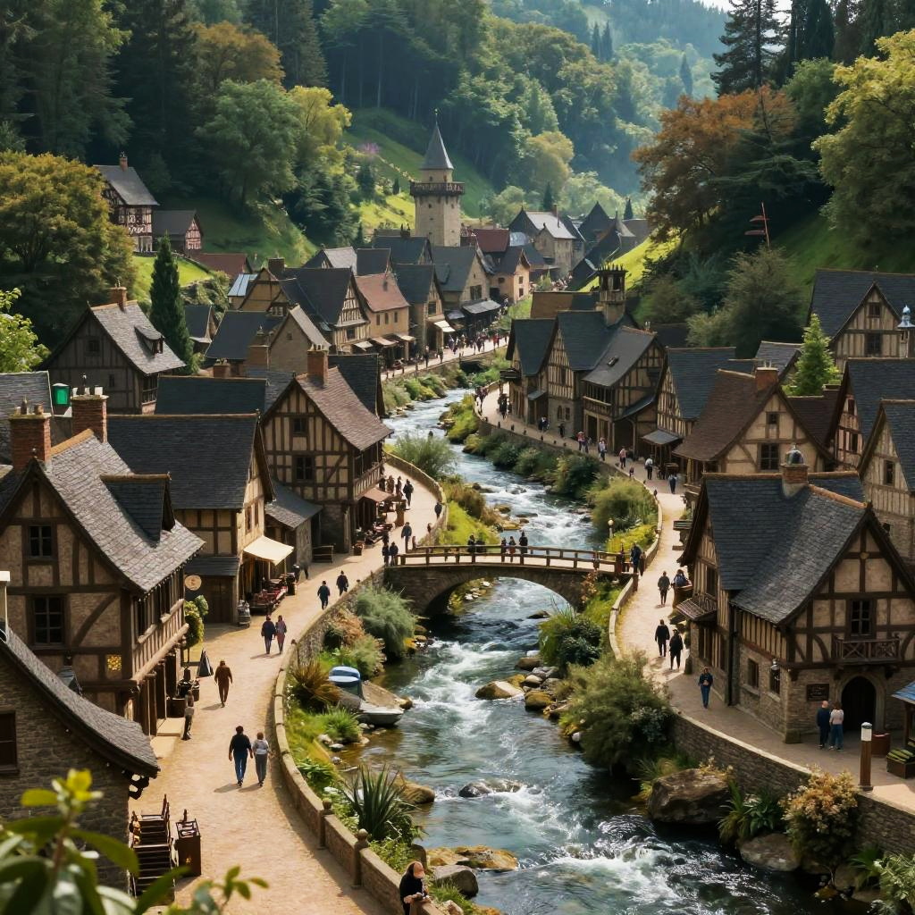 Medieval fantasy town nestled in a lush valley, with timber-framed houses, busy townsfolk, a sparkling river running through, surrounded by mystical forest, enchanted atmosphere, cinematic lighting