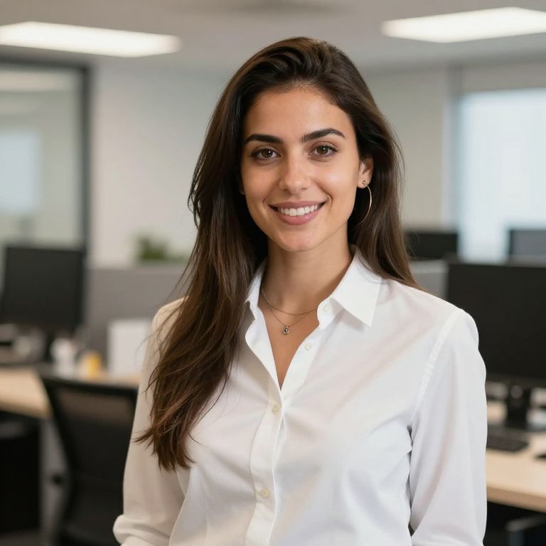 Photograph of a young woman with long, dark brown hair and medium brown skin, smiling directly at the camera. She has dark, well-groomed eyebrows and wears subtle makeup. She is dressed in a crisp, white button-up shirt with the top button undone, and small silver hoop earrings. She has a slim build and is wearing a delicate, thin necklace with a small pendant. The background is a modern, brightly lit office with blurred desks, computers, and office chairs, creating a professional setting. The lighting is even, highlighting her face and attire.