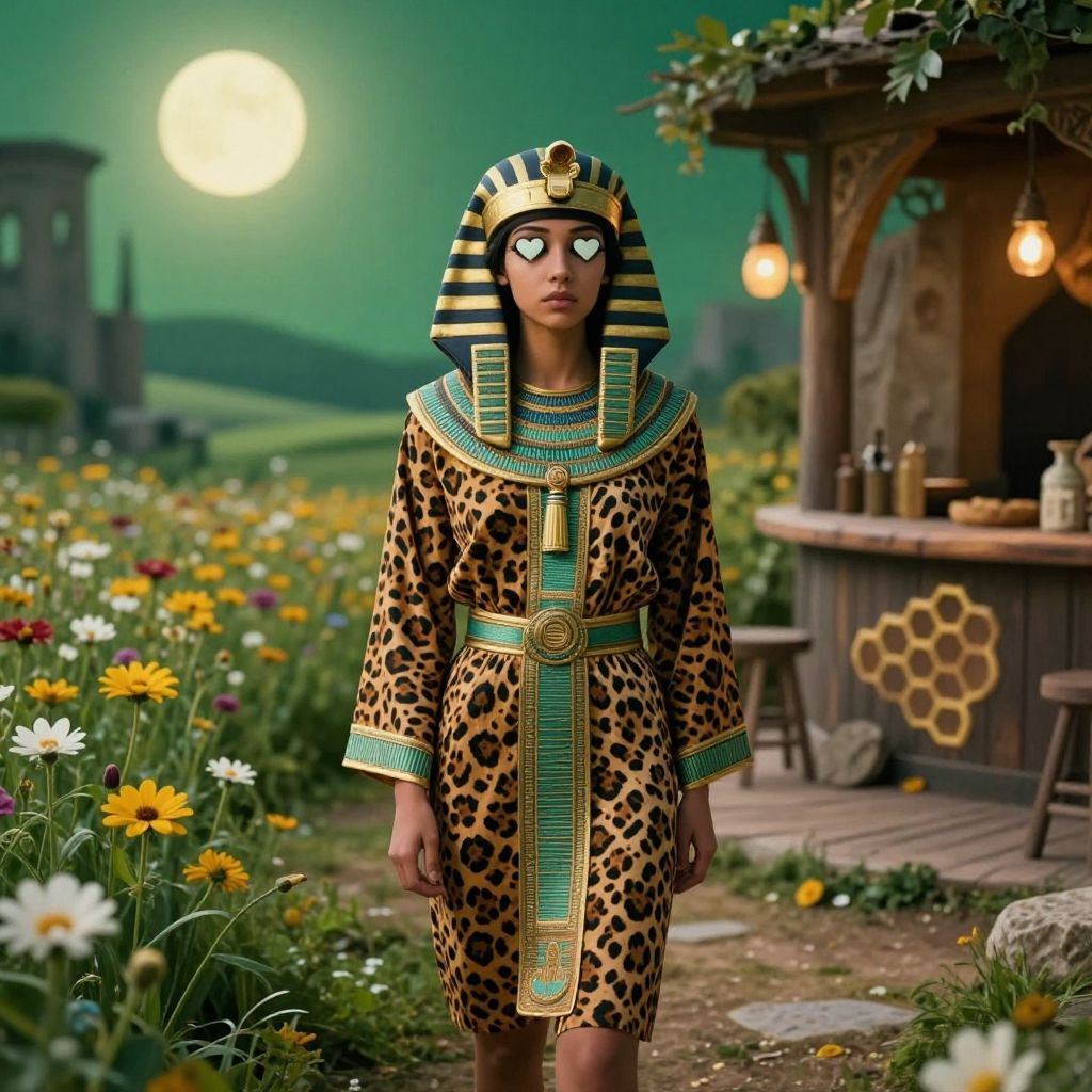 Photograph of a young woman in an Egyptian-style leopard-print dress and striped headdress, standing in a colorful, moonlit garden, with a rustic