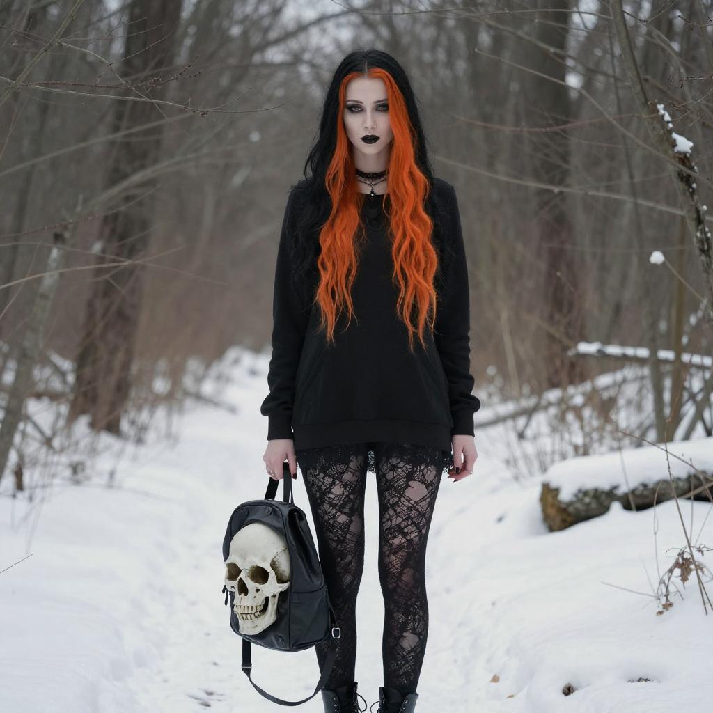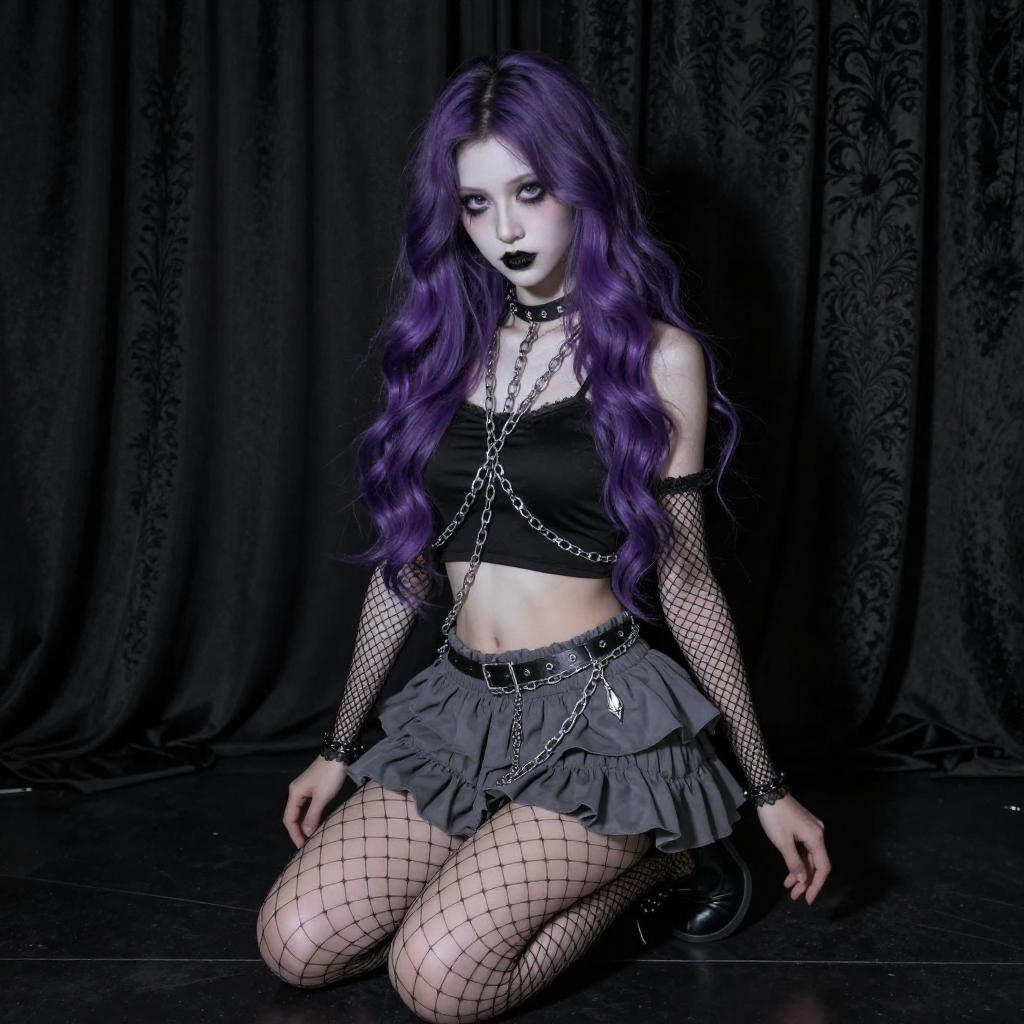 A gothic woman with long, bright green and black hair sits against a weathered wooden wall. She wears a black, off-shoulder lace dress, black boots with silver buckles, and multiple silver chains. Her pale skin contrasts with her dark attire. She has a tattoo on her right thigh and a serious expression. Green plants grow at her feet.