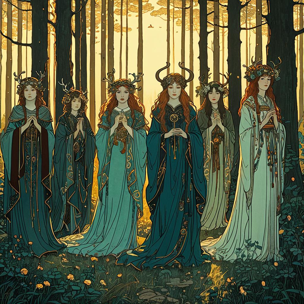 Depict twelve ethereal forest spirits in a twilight glade at golden hour, merging Alphonse Mucha’s Art Nouveau flow combined with Moebius’ surreal textures, inspired by Symbolist paintings and ethereal fantasy art, with stunningly detailed fine inking lines, flat colors, 4k photorealistic.