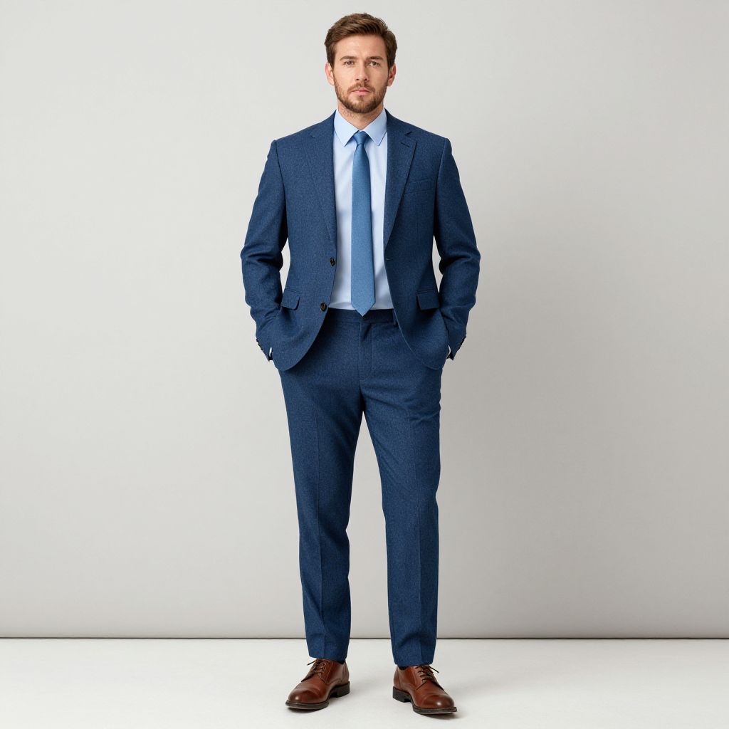 Smart casual blazer costume, 1boy, male focus, solo, jacket, pants, brown footwear, facial hair, hands in pockets, standing, full body, shirt, necktie, realistic, denim, shoes, brown hair, blue pants, suit