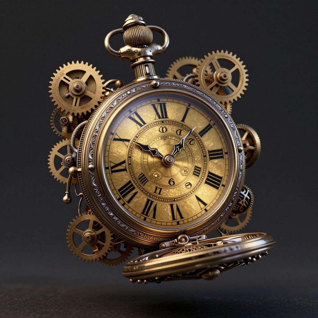 A steampunk pocketwatch fortress, adorned with intricate gears and mechanical embellishments, defies gravity as it rotates endlessly, its golden face revealing Roman numerals that seem to pulse with alternate realities.