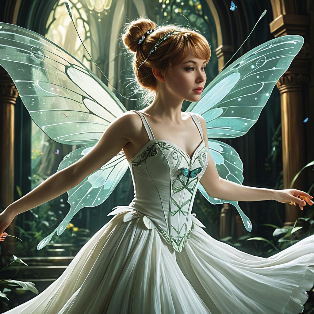 A fantasy woman dressed as a fairy with translucent butterfly wings and a white flowing dress, dancing gracefully in a mystical, cathedral-like environment. The subject has light skin, red hair styled in a bun with a delicate headband, and the image captures an art nouveau style with intricate, elegant details. Soft glowing butterflies flutter around her, enhancing the magical atmosphere.