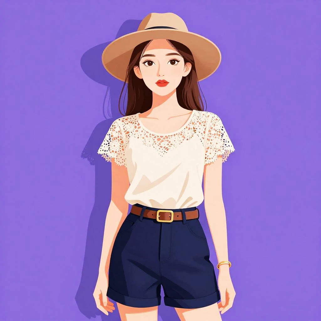 Woman with pretty face and pretty hair. Woman, casual, navy blue marled knit top, three-quarter sleeves, round neckline, slim-fit taupe pants, wide-brimmed felt hat in camel color, chunky wrist accessory. --sref 1467