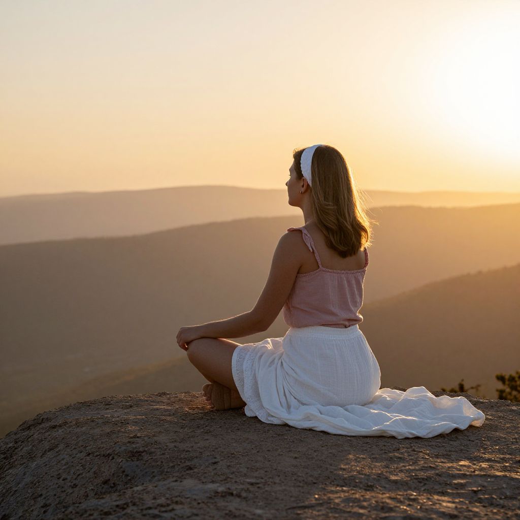 A photograph of a woman with light brown hair in a white headband, sitting cross-legged on a rocky hilltop at sunset. She's wearing a pink sleeveless top and a white skirt, with a white cloth spread on the rocks beside her. She's gazing into the golden, hazy mountains in the background. The warm sunlight casts a soft glow over the scene, creating a peaceful, contemplative atmosphere.