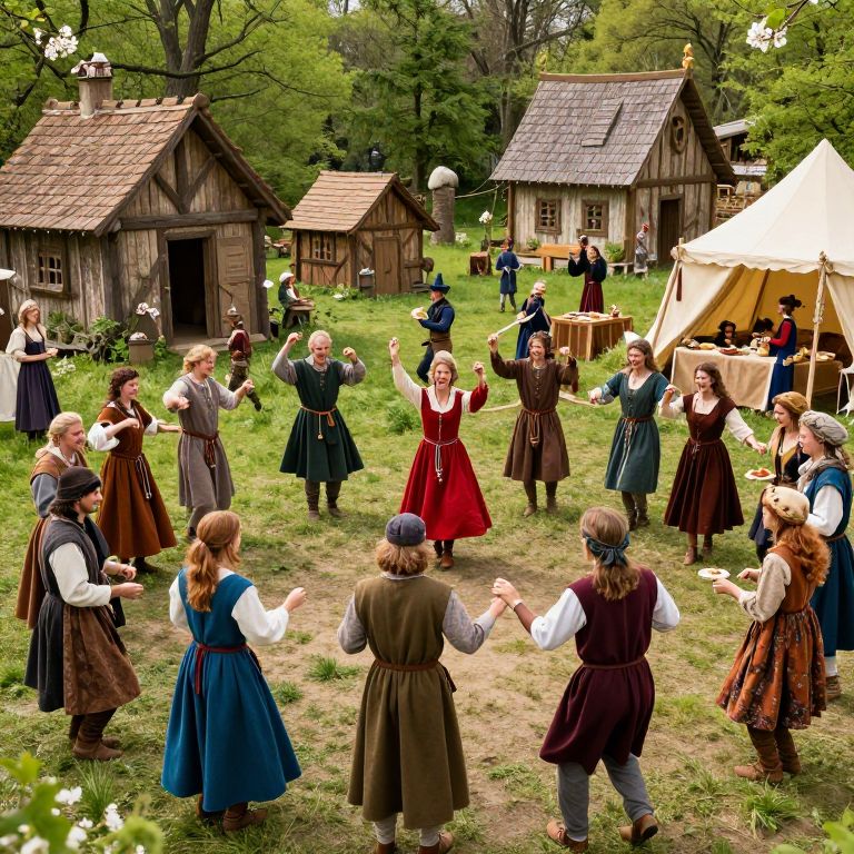 Cloning a festival of spring with people excitedly dancing and feasting. High fantasy. Colorful. Photorealistic. Medieval style. Forest village background - Upscaled by,