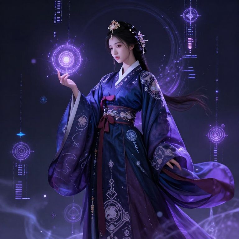 Digital artwork of an Asian woman in a dark blue, ornate kimono with glowing purple circles and mystical symbols, holding a radiant orb against a star