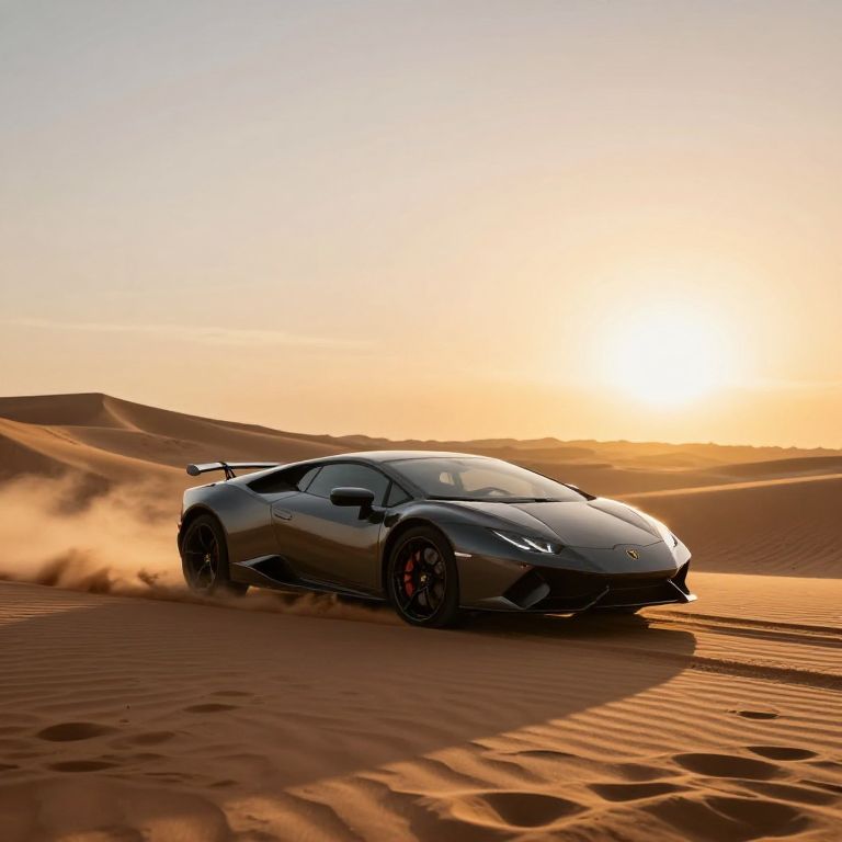 Lamborghini Huracán parked on a desert dune under a golden sunset, desert wind blowing sand, rugged terrain, dramatic shadows, cinematic composition, photorealistic, wide-angle view, MidJourney style.