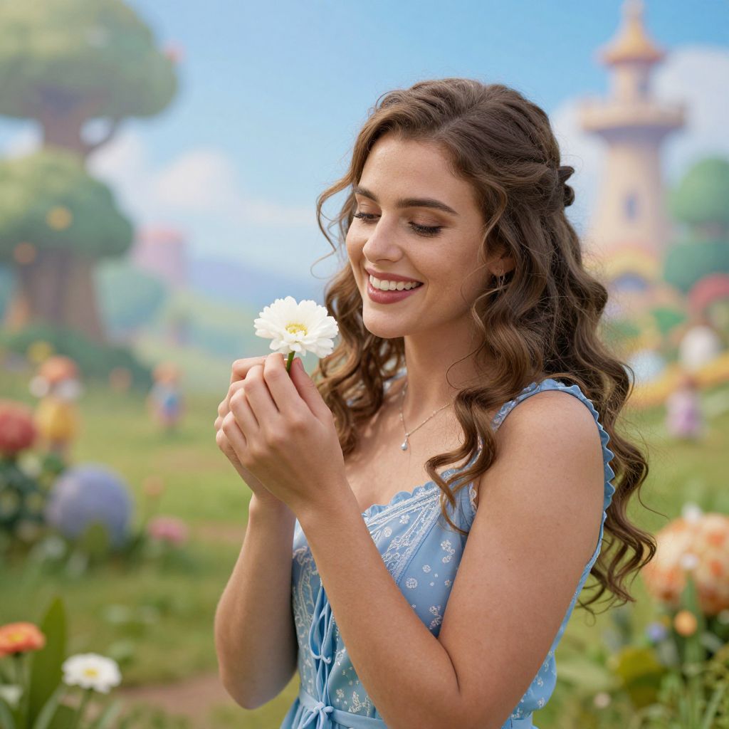 Amidst the vibrant hues of a dreamlike fantasyland, a woman clutches a delicate white flower, her radiant smile a poignant reminder of resilience and hope, as if weaving a thread of memory into the ephemeral tapestry of joy.