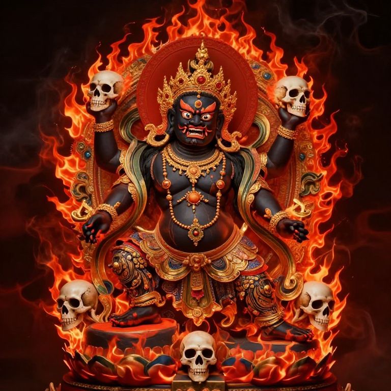 Digital artwork depicting a dark-skinned, menacing deity with six arms, adorned in elaborate gold jewelry and a crown. The deity has red eyes, a fierce expression, and is surrounded by bright, fiery orange flames. Each hand holds a white skull, while additional skulls surround the base of the throne. The background is black, highlighting the intense red and gold colors. The deity's attire includes ornate patterns and textures, with a large, red, circular halo behind its head. The overall style is vibrant and dramatic, with a strong contrast between the dark figure and the bright flames.