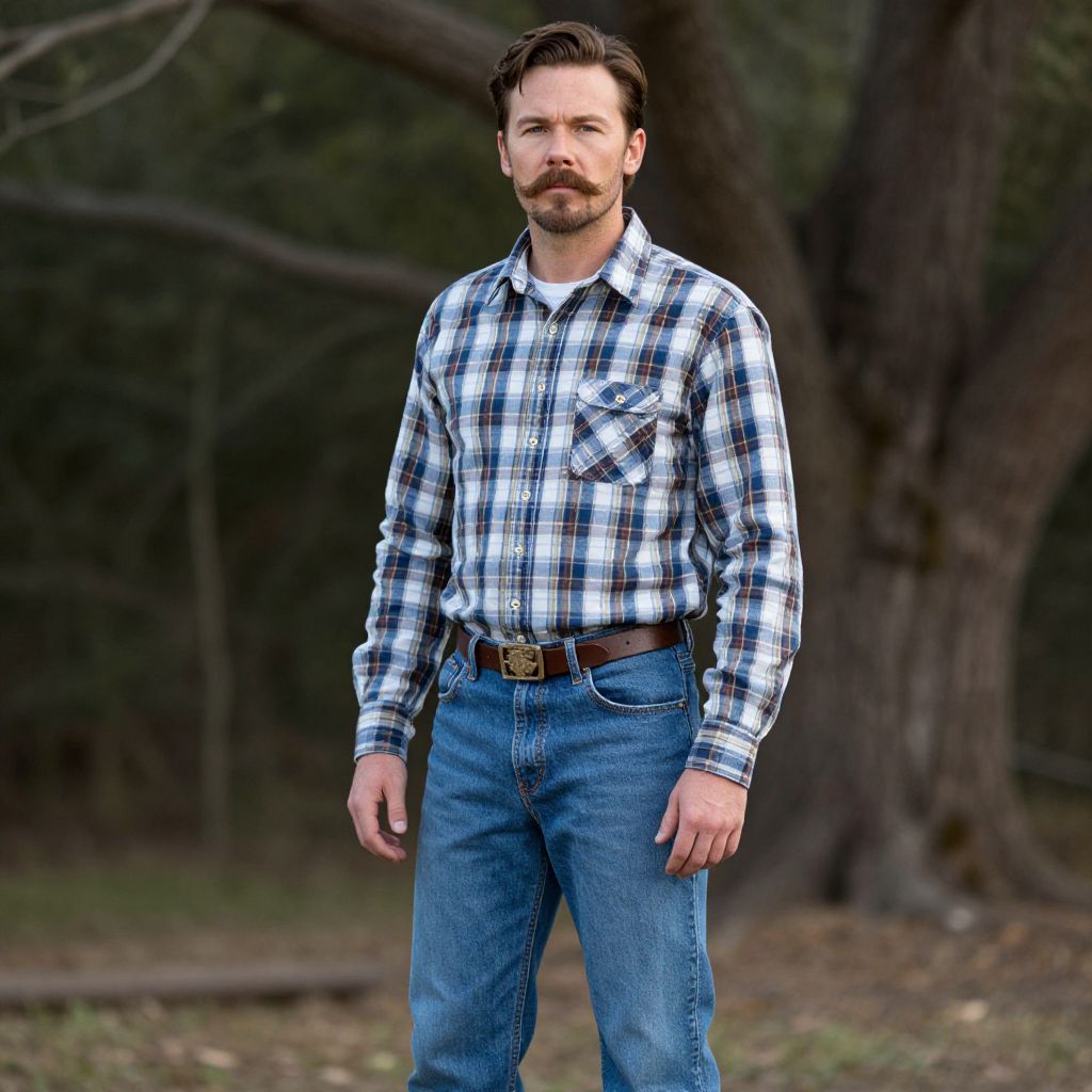Photograph of a bearded man with dark hair, wearing a blue and white plaid shirt, blue jeans, and brown belt, standing in a