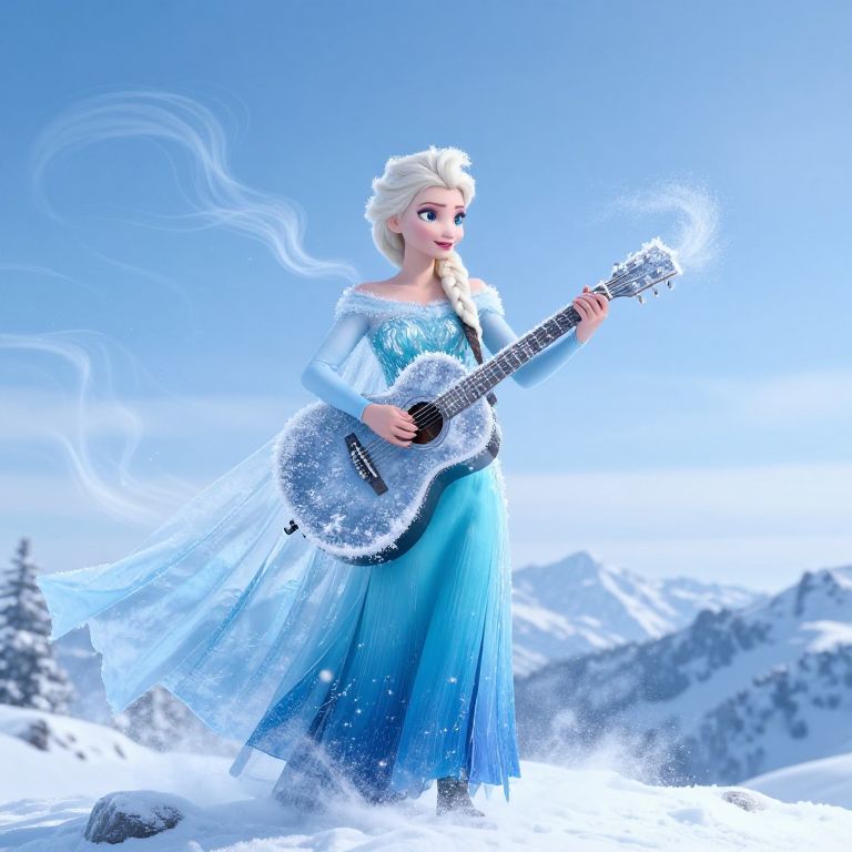 Digital artwork of Elsa from Frozen standing in a snowy mountain landscape. Elsa, with her platinum blonde hair in a braid, wears a shimmering blue off-shoulder gown with intricate ice-like patterns. She holds a silver acoustic guitar adorned with sparkling snowflakes, with swirling white smoke around her. The background features a bright blue sky and snow-covered evergreen trees. Elsa's expression is serene, and her dress flows gently in the wind. The overall style is vibrant and highly detailed, capturing the magical essence of her character.