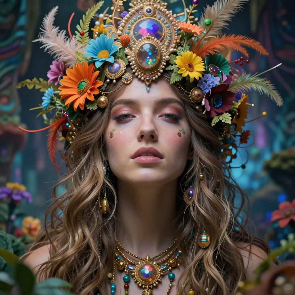 Digital art of a fair-skinned woman with wavy brown hair, wearing a vibrant, flower-adorned gold crown and matching jewelry, set against