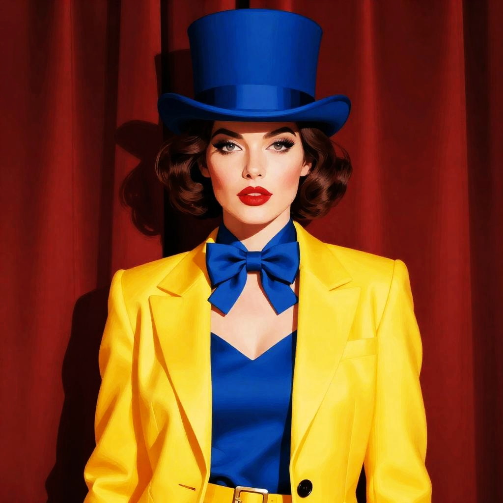 Digital pop art-style portrait of a confident fair-skinned woman with red lipstick and short curly brown hair. She is wearing a bright yellow jacket over a blue top, a blue bow tie, and a matching blue top hat. The background consists of dark red curtains, emphasizing the bold and vibrant color contrast of her outfit.