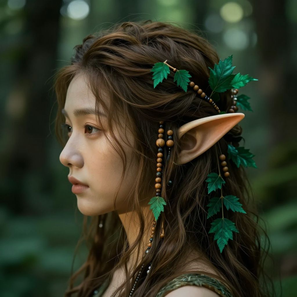 Photorealistic digital art of an elven woman with long brown hair, pointed ears, green leaf and bead adornments, in a forest.