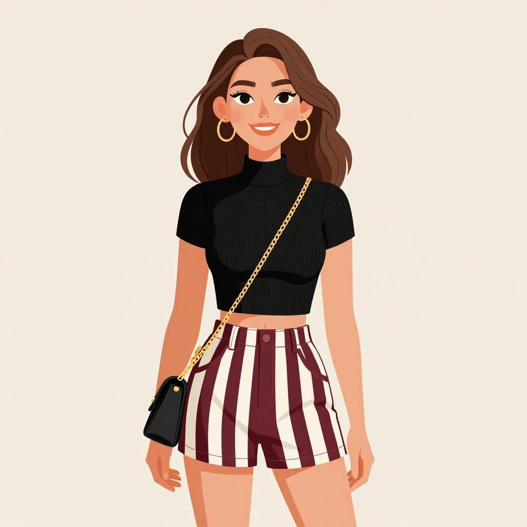 Woman with pretty face and pretty hair. smiling Woman, casual chic, black ribbed turtleneck crop top, high-waisted shorts with burgundy and white vertical stripes, fitted waistband, black crossbody bag with gold chain strap, natural hair flowing. --sref 1467