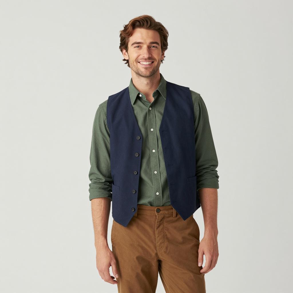 Man on the left with brown hair, green shirt, blue vest, and brown pants, smiling.