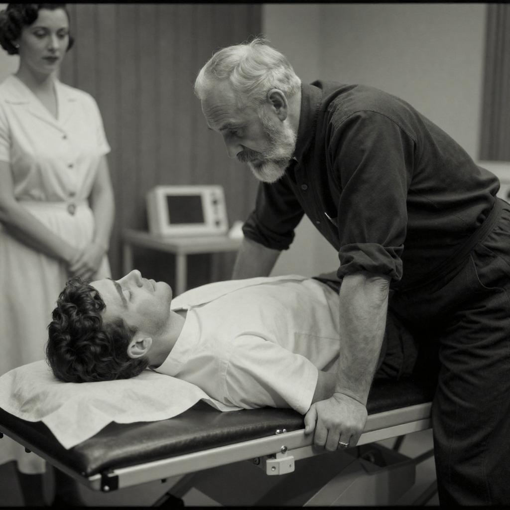 Black-and-white photograph of a vintage film scene. A bearded man with white hair, wearing a dark shirt, leans over a reclining man with dark hair, dressed in a light shirt, lying on a medical table. A woman in a white dress stands to the left, observing. The background features a wooden wall and medical equipment. The image has a green tint.