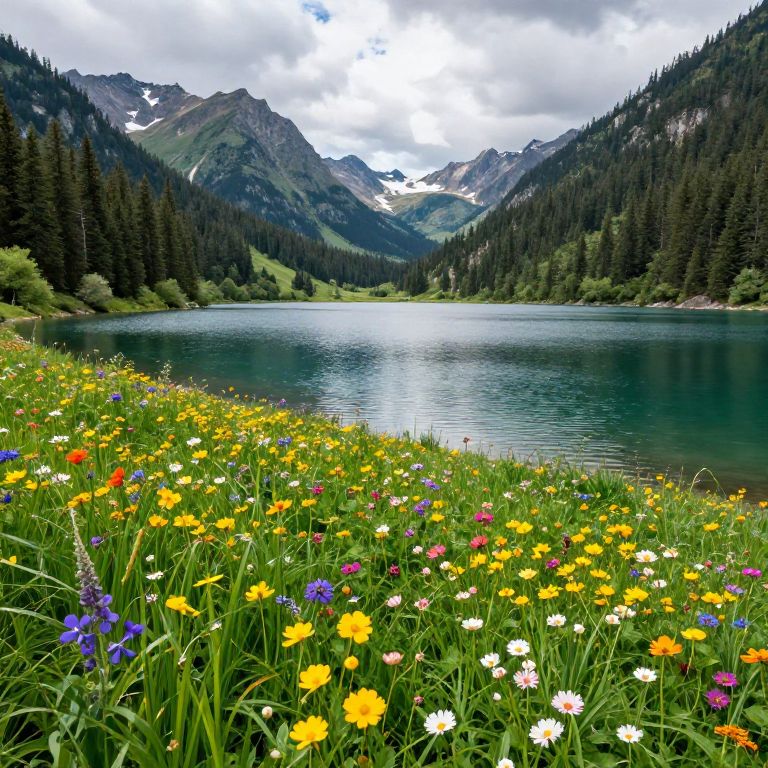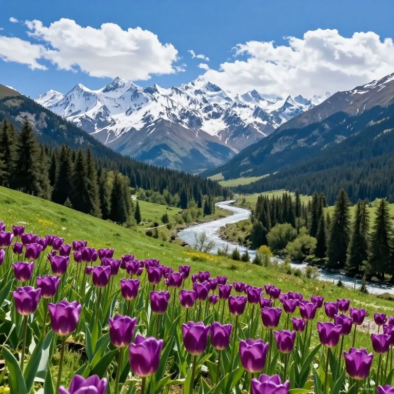 Photograph of a vibrant spring landscape featuring a foreground of purple tulips in full bloom, with green stems and leaves. Behind the tulips, a lush green meadow slopes down to a winding river, bordered by dense, dark green pine trees. The mid-ground reveals rolling hills, leading to a dramatic backdrop of snow-capped mountains under a bright blue sky with scattered white clouds. The image captures the contrast between the colorful tulips and the natural, rugged beauty of the mountainous terrain, creating a picturesque and serene scene.