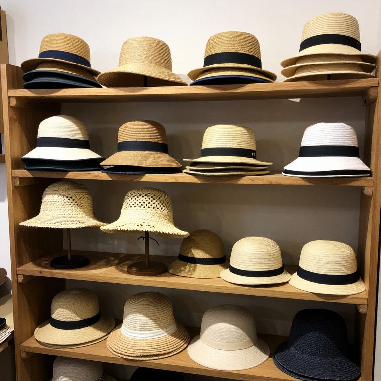 Neatly arranged shelves display twelve colorful fedoras with vibrant ribbon accents, featuring shades of beige, pink, red, blue, and gray, alongside a whimsical stuffed creature perched atop the display in a cozy gift shop setting.