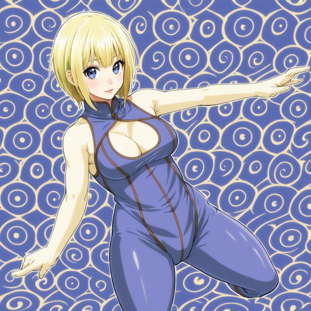 Monk (fft), final fantasy, 1girl, blue eyes, short hair, blonde hair, large breasts, cleavage, bare shoulders, unitard, unitard, by artist hikawa shou, anime