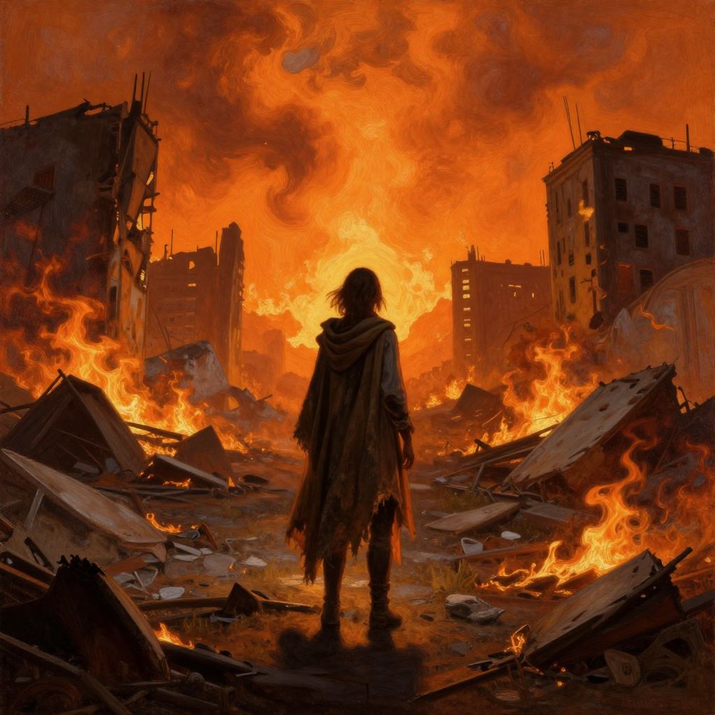 Digital artwork depicting a silhouetted figure with a hooded cloak standing amidst a devastated, burning cityscape. The figure, centered and facing away, is surrounded by bright, intense orange and yellow flames consuming crumbling buildings. Debris and rubble are scattered across the ground, adding to the destruction. The background features two partially collapsed, charred buildings on either side, with flames engulfing their upper portions. The overall scene is dramatic and apocalyptic, with the fiery sky and dark, smoky atmosphere enhancing the sense of chaos and destruction. The figure's silhouette is stark against the blazing background.