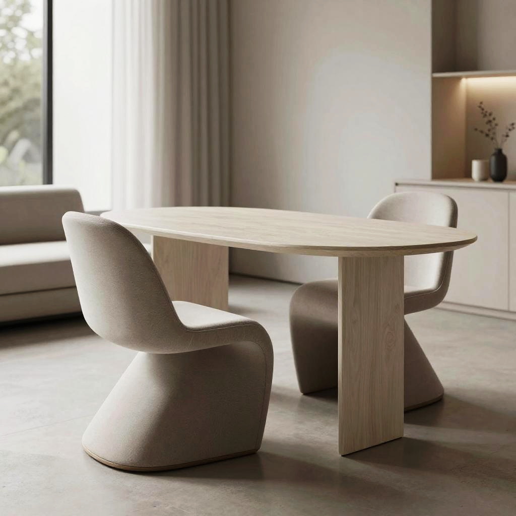 AI furniture design generator creating sleek, futuristic chairs and tables in a minimalist modern living space, emphasizing ergonomic curves and innovative materials, soft natural lighting highlighting textures and shapes, high-resolution digital art.