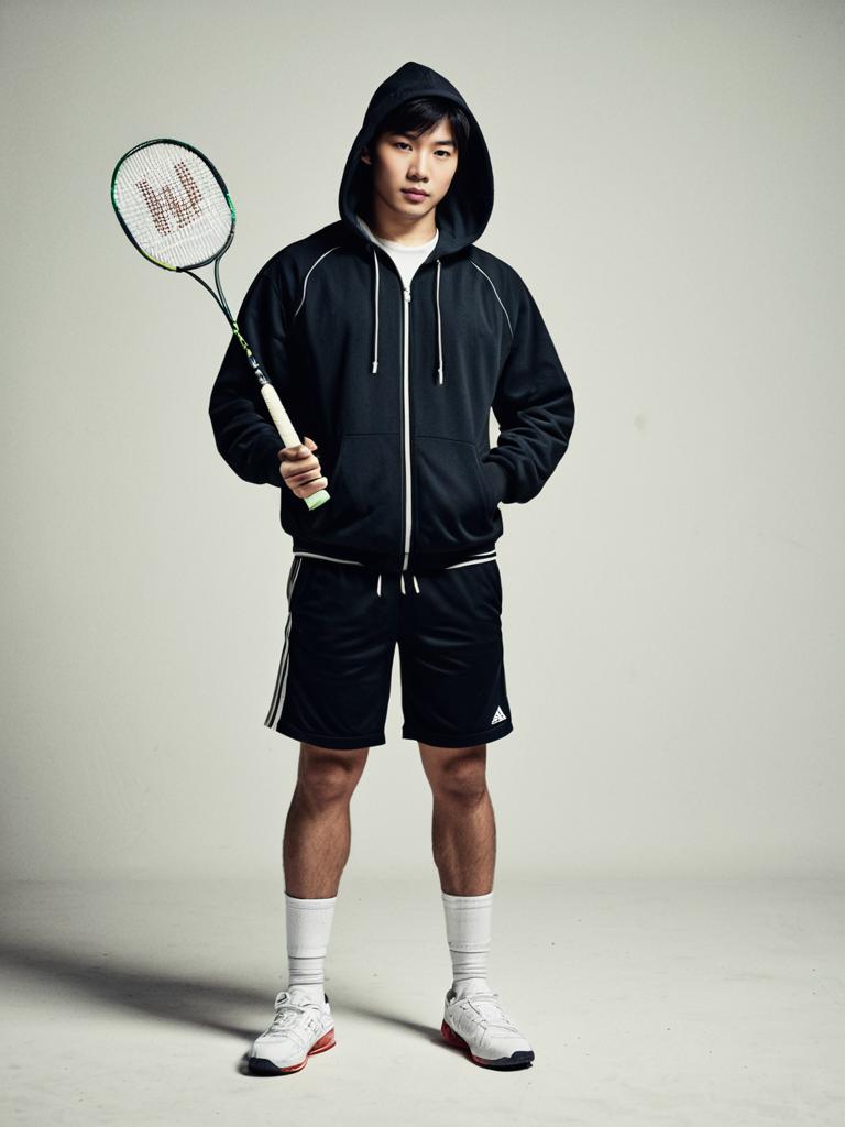 Full-length portrait of an Asian young male badminton player wearing a black hoodie and black shorts, holding a badminton racket. He stands confidently against a plain background wearing white athletic shoes and socks, showcasing a sporty casual outfit.