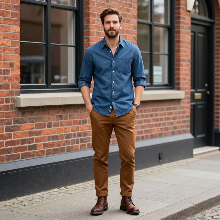 Photograph of a handsome guy standing on a cobblestone sidewalk in front of a brick building with black-framed windows and doors. He has short brown hair, a beard, and is wearing a blue button-up shirt with rolled-up sleeves, brown pants, and brown boots. His hands are in his pockets, and he's looking at the camera with a slight smile. The lighting is bright, highlighting his casual, stylish look.