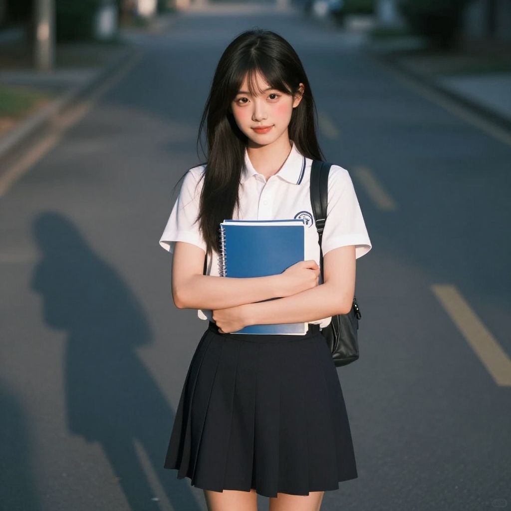 Hyper-Stereotypical 90' high-school 18yogirl in educated outfit, stunning, beautiful, long hair, medium skirt, white polo shirt, super shy, super cute, blushing, looking at the viewer while holding school books with both arms.Looking at the viewer while smiling.Dusk.Long shadows.Life-like details.Cinematic. Dramatic. Dynamic. Extremely refined lines and and shapes.Extremely refined details on objects.Sharp details.Wide range of colors.Many details everywhere. Ray-Tracing. Anti-Aliasing. Realistic soft shadows. Low saturation colors. Insane quality. Insane resolution. Insane details. Masterpiece. 32k resolution.