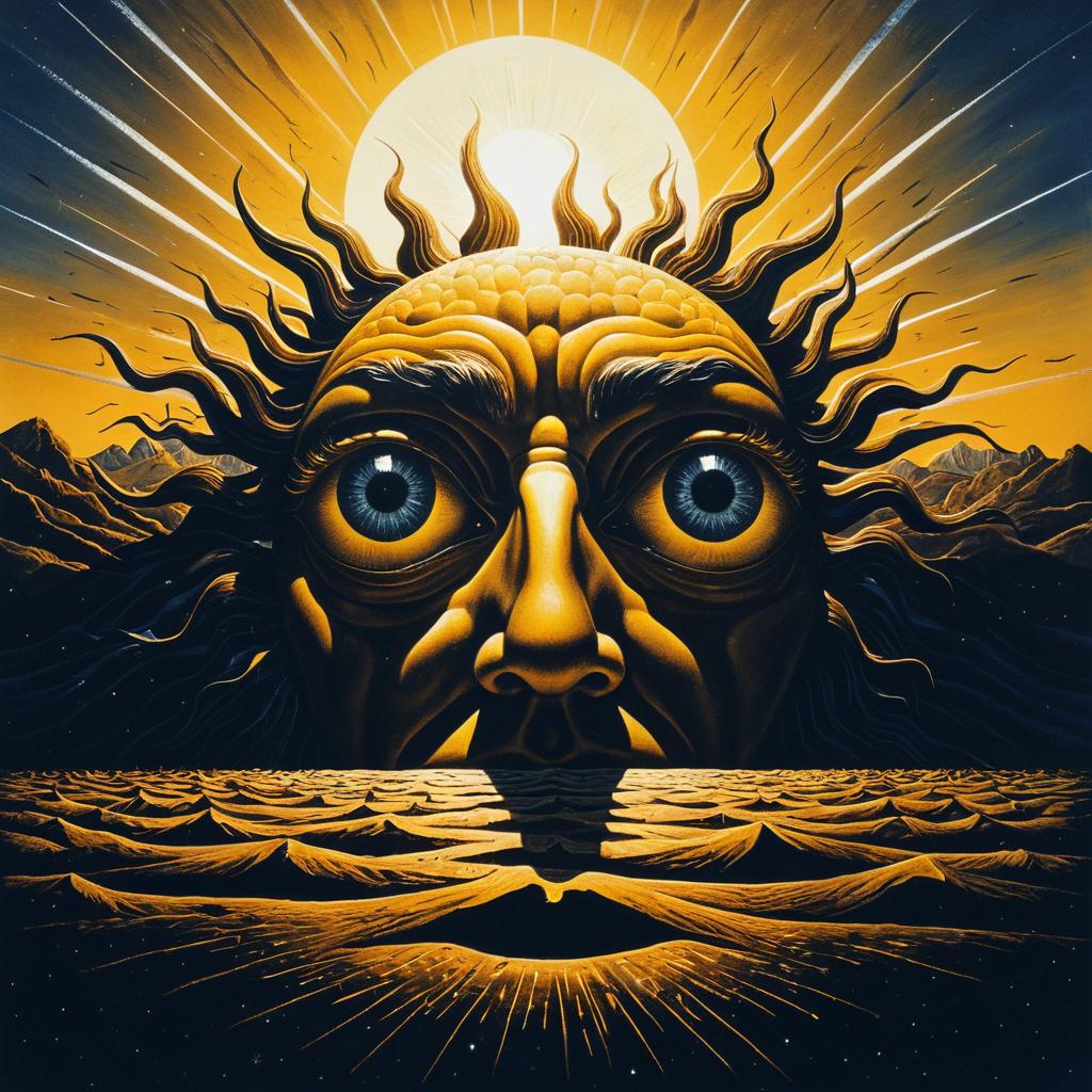 Sun rising in the sky with eyes, in the style of surrealism, rich ochre and deep navy, inspired by Salvador Dalí, incorporating mysticism and dreamscapes, with sunrays shining upon it