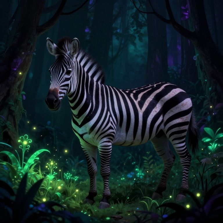 Artistic rendering of a cebra in a mystical forest setting, illuminated by bioluminescent plants and glowing fireflies, the contrasting black and white stripes creating striking patterns against deep green and purple hues, fantasy inspired scene.