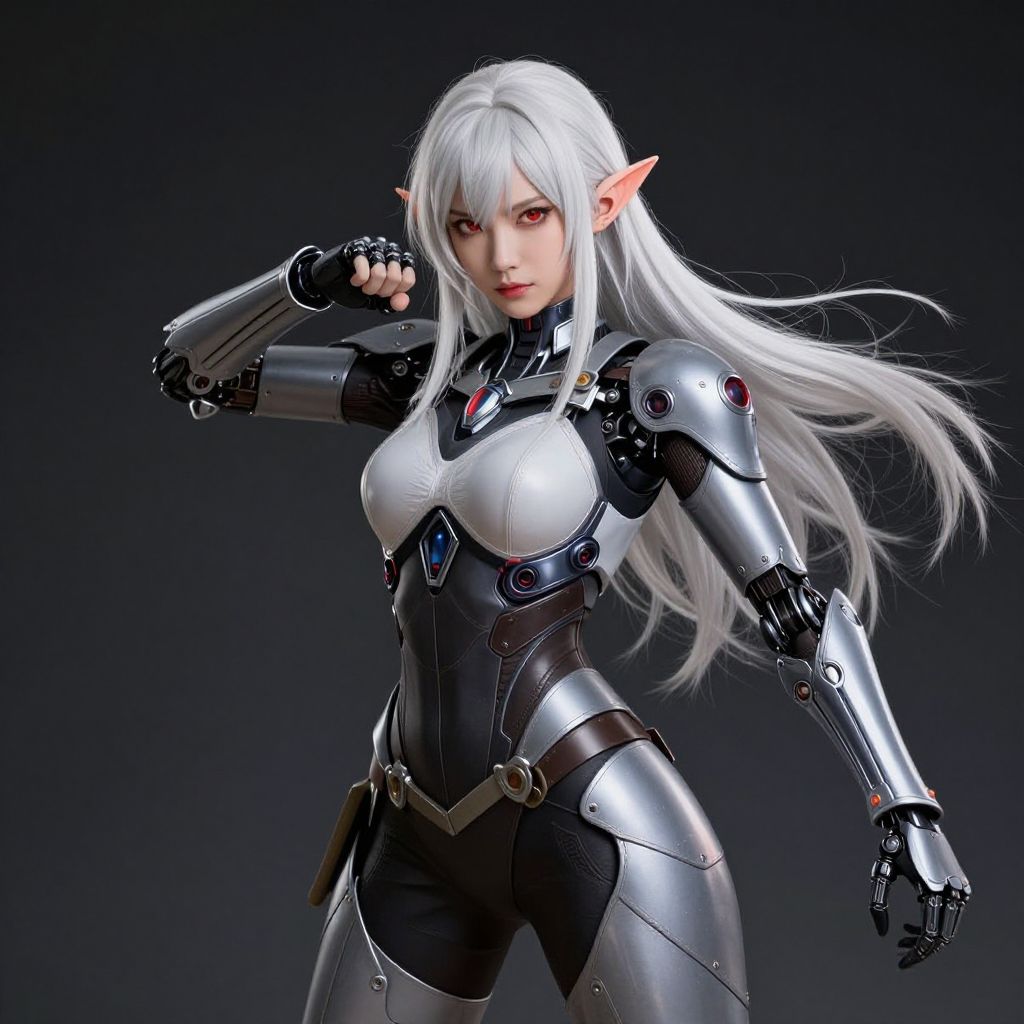 A warrior woman with elf ears, long white hair, and red eyes, wearing a biomechanoid suit, stands in a combat pose.