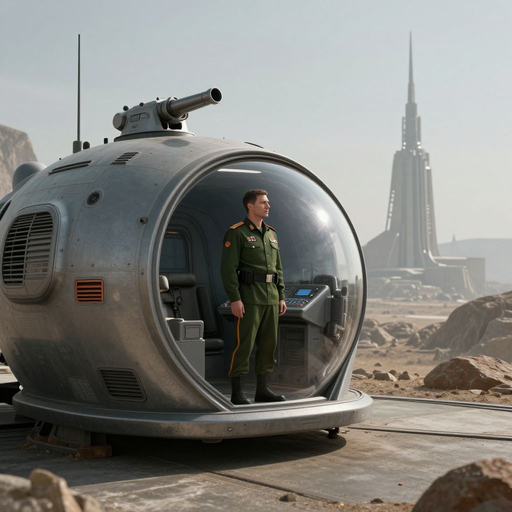 In this futuristic scene, a man in a green military uniform stands inside a sleek, futuristic pod, gazing out at a desolate landscape. The pod, with its metallic exterior and large, rounded window, is equipped with various control panels and a small cannon on its top. The man's uniform is adorned with medals and epaulettes, suggesting a high-ranking position. In the background, a towering structure with a spire stands against a hazy sky, while a rugged, rocky terrain stretches out beneath. The overall composition is dynamic, with the man's figure positioned centrally, the pod to his left, and the distant structure to his right, creating a sense of depth and perspective. The colors are muted, with shades of green, gray, and brown dominating the scene, enhancing the futuristic and otherworldly atmosphere.