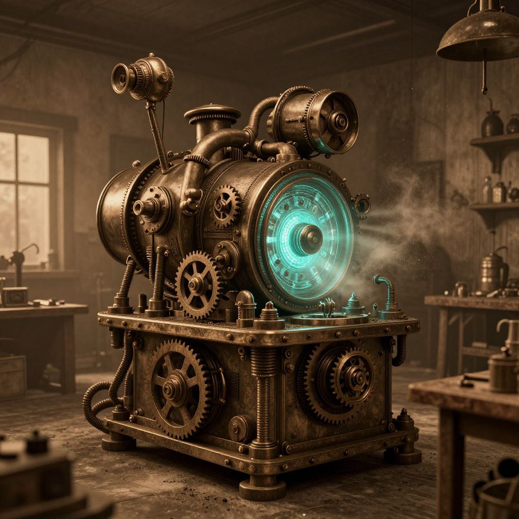 Steampunk-style, glowing, industrial machine with gears and pipes in a dimly lit, rustic workshop, emitting bright blue light and steam. Phot
