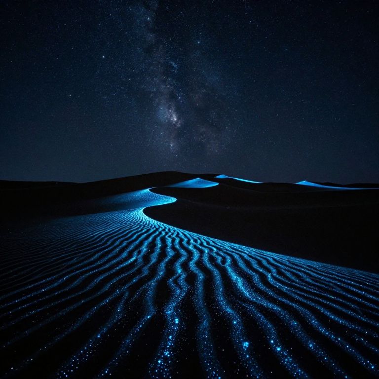 Under the starlit desert sky, bioluminescent dunes ripple with ethereal whispers of forgotten tongues, their transient glow weaving a silent narrative of time's endless dance between creation and erasure.
