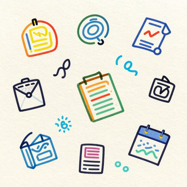 Graphic drawing easy: An artistic and playful graphic drawing full of colorful, easy-to-draw doodles and icons, sketched with smooth curves and clean outlines on light textured paper, evoking a relaxed and fun learning atmosphere.