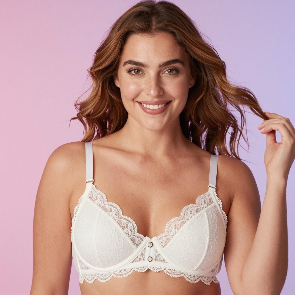 Photograph of a woman with light brown, wavy hair, smiling, wearing a white lace bra with lace trim and small center button. She has fair skin, brown eyes, and is holding her hair with her right hand. Background has a gradient of pink and purple. Upper body focused.