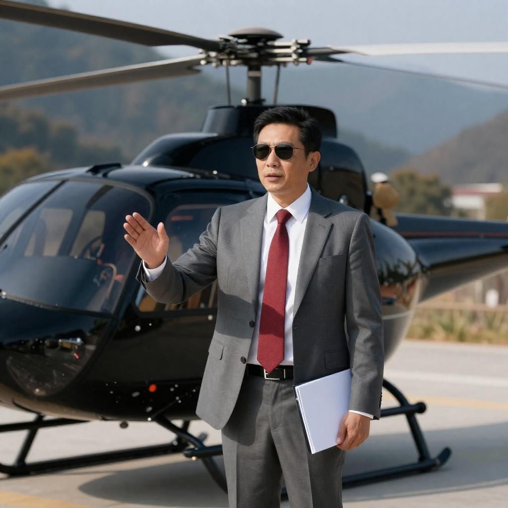 Photograph of a man in a gray suit, white shirt, and red tie, standing beside a black helicopter. He wears sunglasses and gestures with his right hand while holding a white folder in his left. The background shows a mountainous landscape with autumn foliage. The helicopter's rotor blades are visible above.